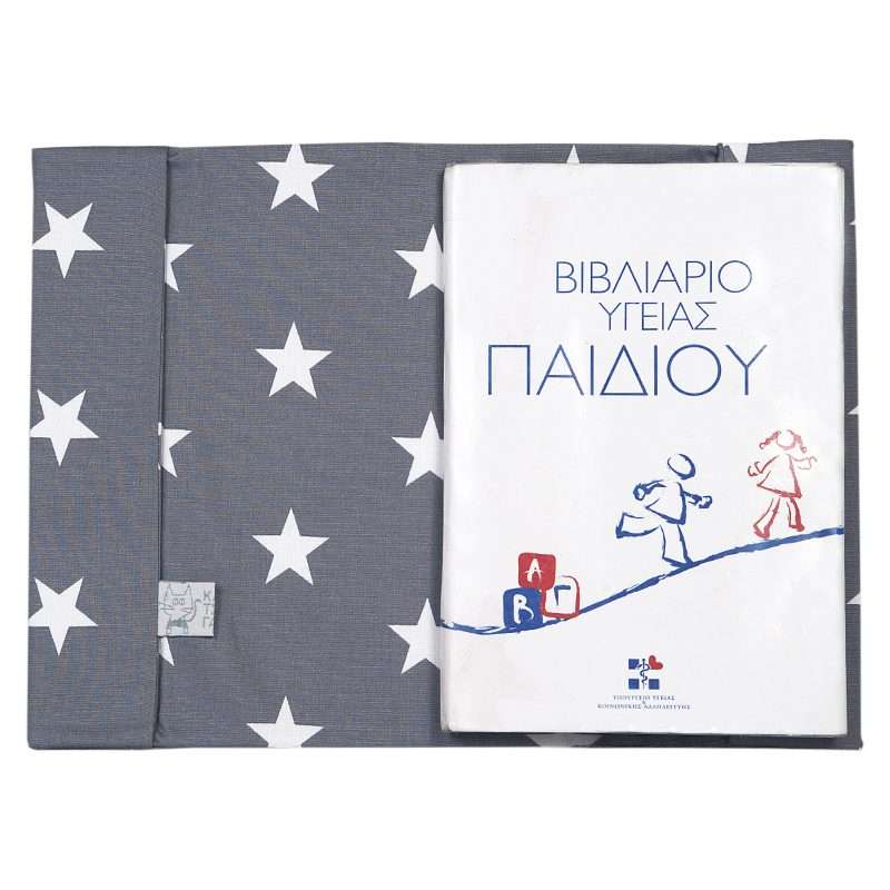 Χειροποίητη υφασμάτινη Θήκη με μοτίβο Αστέρια σε γκρι φόντο, για το βιβλιάριο υγείας του μικρού σας. Σας παρέχουμε τη δυνατότητα να κάνετε τη θήκη για το βιβλιάριο μοναδική, δημιουργώντας ένα ξεχωριστό κέντημα της επιλογής σας.