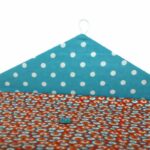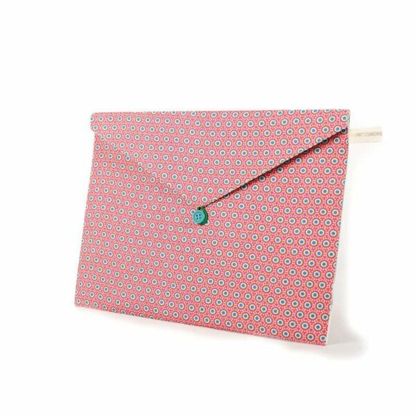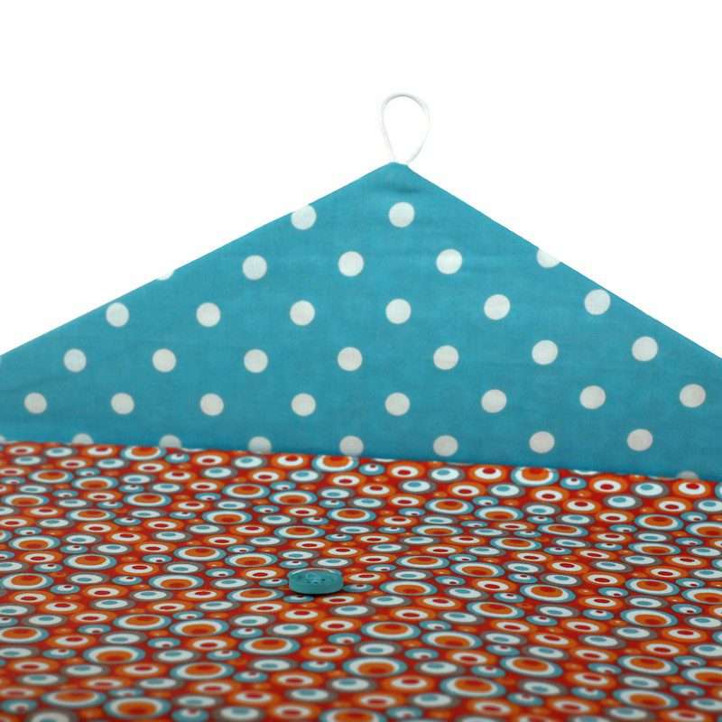 Χειροποίητο Υφασμάτινο Ντοσιέ για αποθήκευση εγγράφων Α4 και όχι μόνο, με μοτίβο Γεωμετρικοί Κύκλοι. Εσωτερικά είναι επενδεδυμένο με τυρκουάζ πουά ύφασμα. Κλείνει με λαστιχάκι και κουμπί.