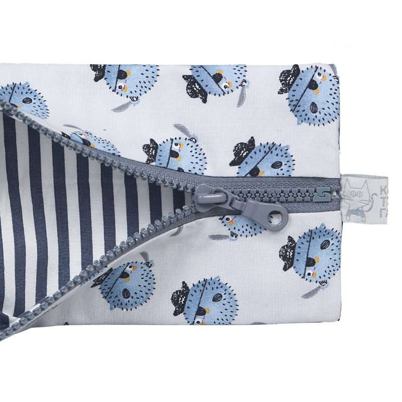 Χειροποίητη υφασμάτινη Κασετίνα με μοτίβο Αχινοί Πειρατές. Εσωτερικά είναι επενδεδημένη με γκρί ριγέ ύφασμα. Κλείνει με φερμουάρ ίδιου χρώματος.