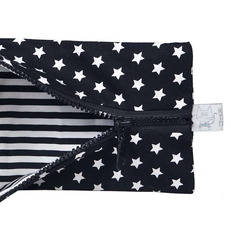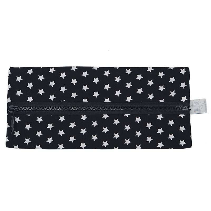 Χειροποίητη υφασμάτινη Κασετίνα με μοτίβο Αστέρι μαύρο. Εσωτερικά είναι επενδεδημένη με μαύρο ριγέ ύφασμα. Κλείνει με φερμουάρ ίδιου χρώματος.