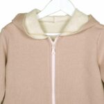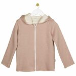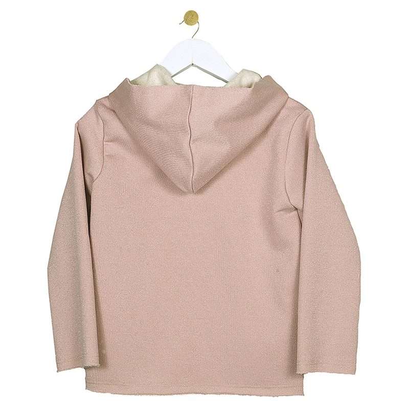Παιδική μακρυμάνικη ζακέτα με κουκούλα, στο χρώμα του σάπιου μήλου και ασημόσκονη. Κλείσιμο με φερμουάρ στο μπροστινό μέρος. Ιδιαίτερα, απαλή ποιότητα.