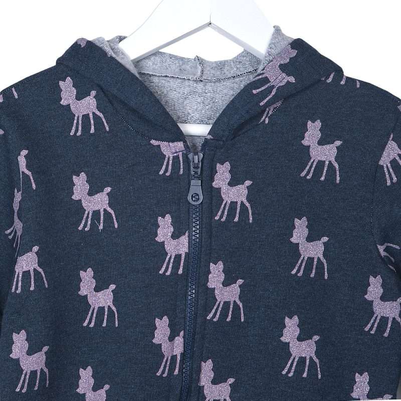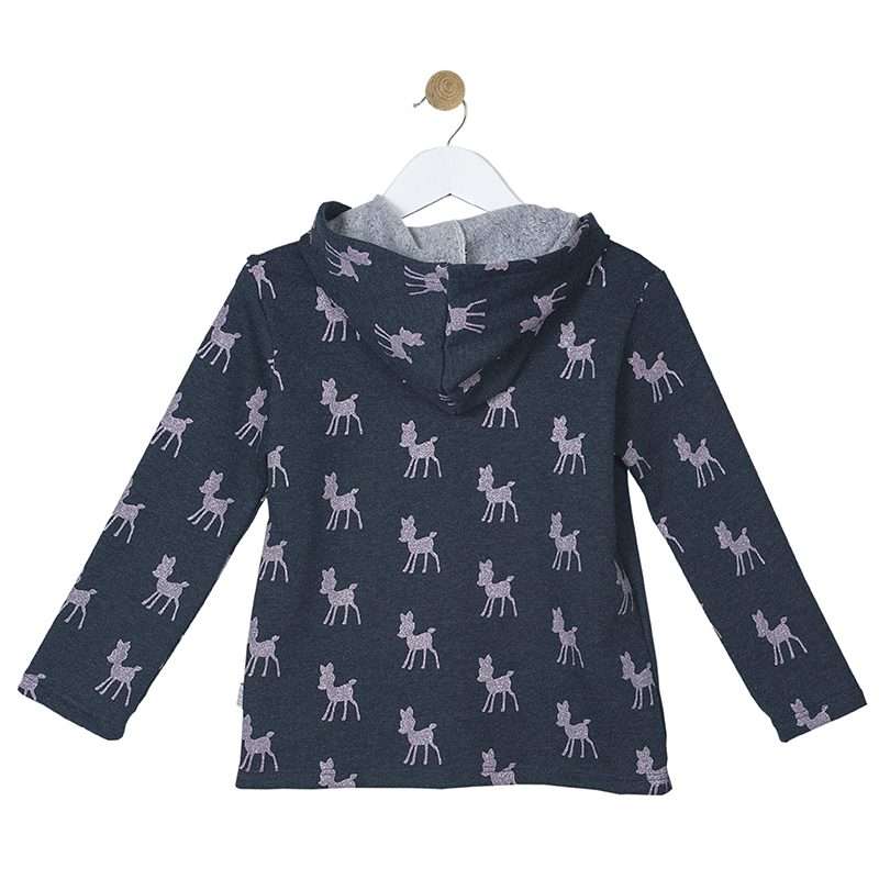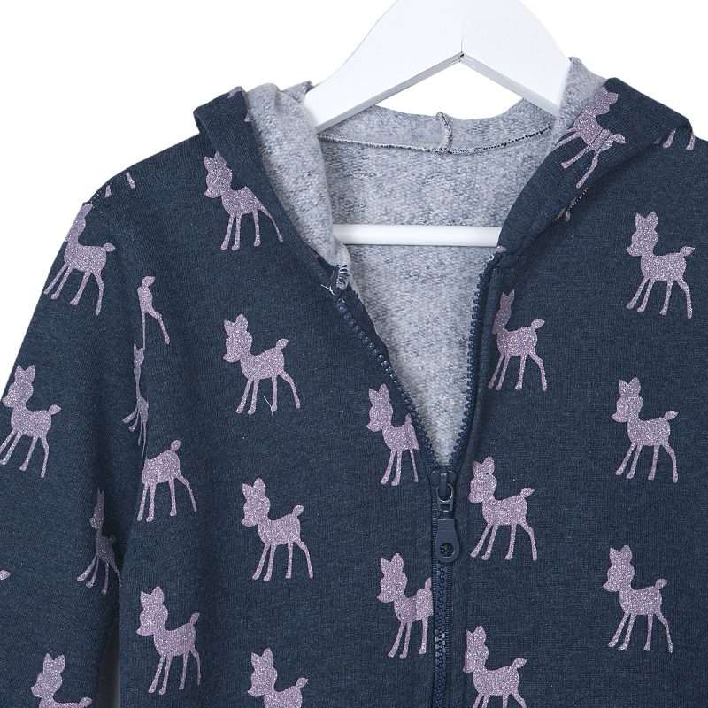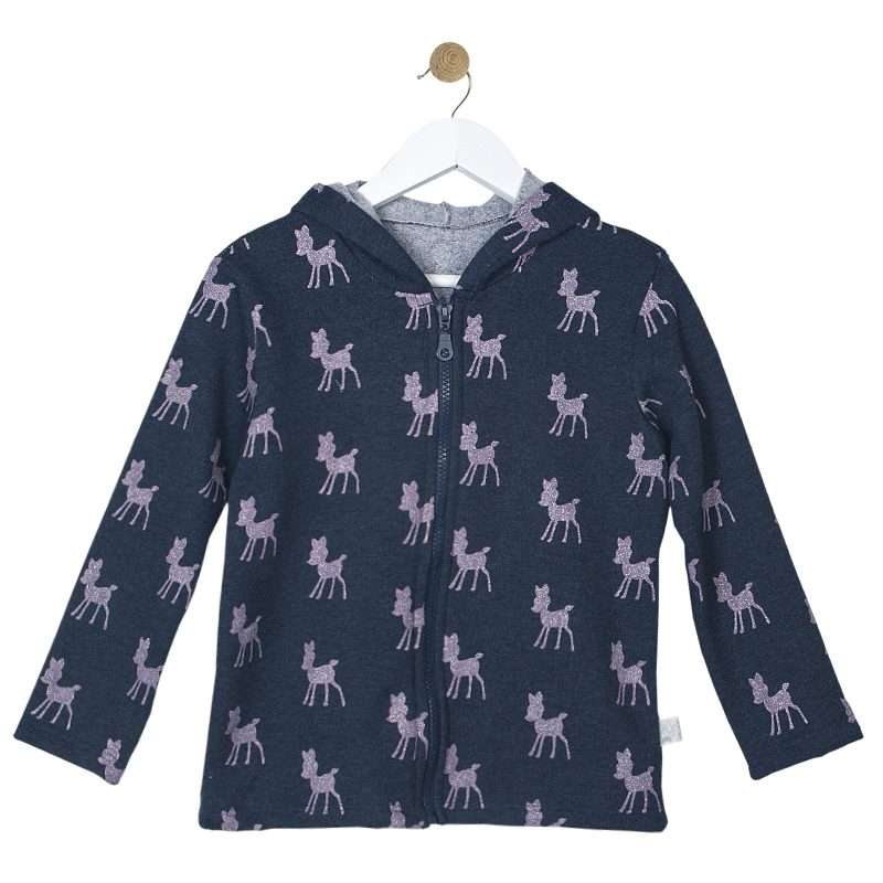 Παιδική μακρυμάνικη ζακέτα με κουκούλα και μοτίβο Ελαφάκια με ασημόσκονη. Κλείσιμο με φερμουάρ στο μπροστινό μέρος. Ιδιαίτερη, απαλή ποιότητα.