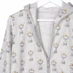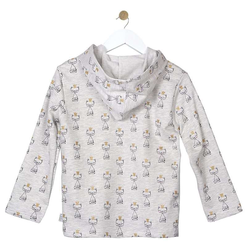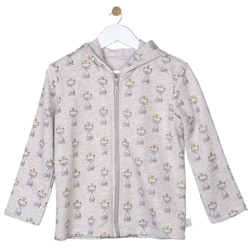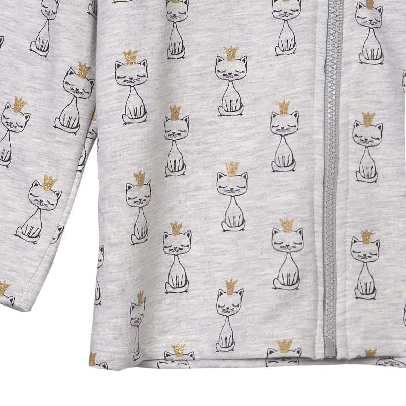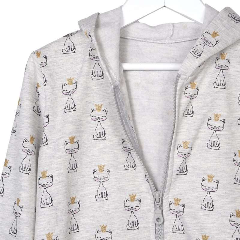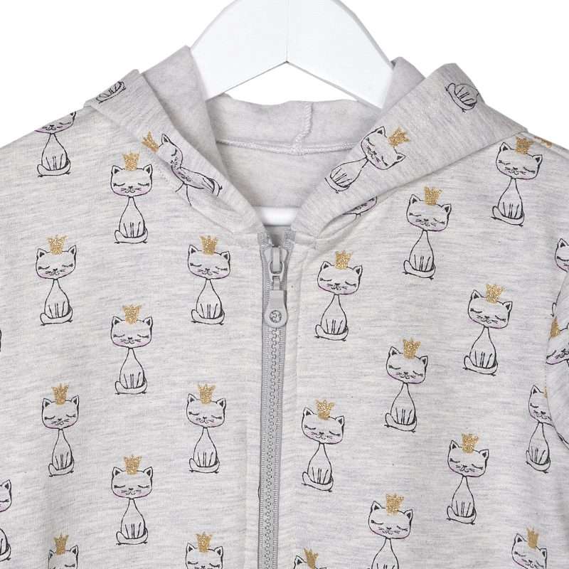 Παιδική μακρυμάνικη ζακέτα με κουκούλα και μοτίβο Γάτα Πριγκίπισσα με χρυσόσκονη. Κλείσιμο με φερμουάρ στο μπροστινό μέρος. Ιδιαίτερα, απαλή ποιότητα.