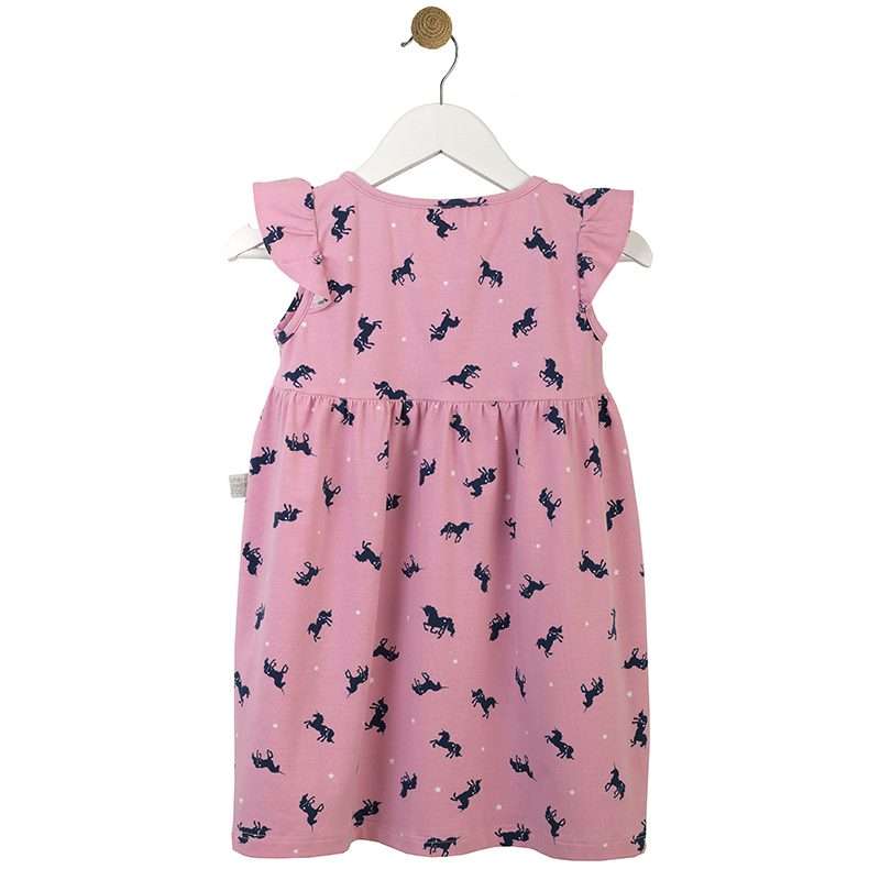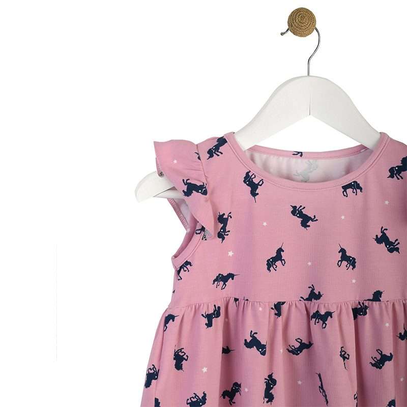 Παιδικό φόρεμα για κορίτσια με μοτίβο Μονόκερους, σε αμπίρ γραμμή. Το μικροσκοπικό μανικάκι πεταλούδα, του δίνει ένα ιδιαίτερα ρομαντικό στίλ. Δροσερό και άνετο για τους καλοκαιρινούς μήνες.