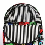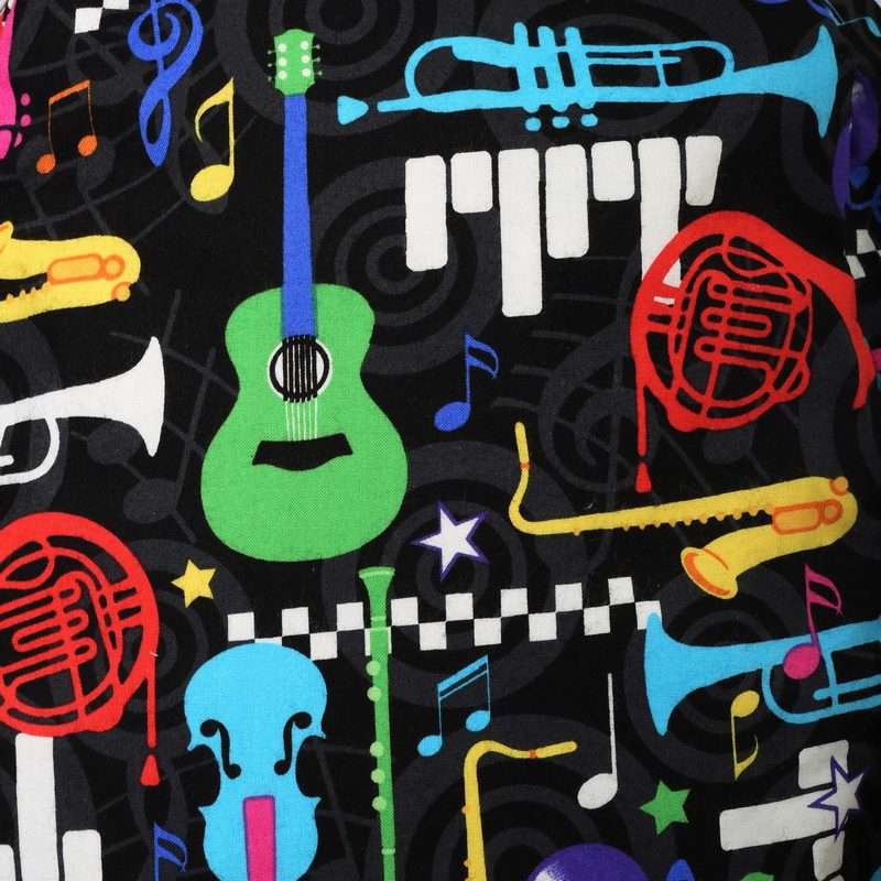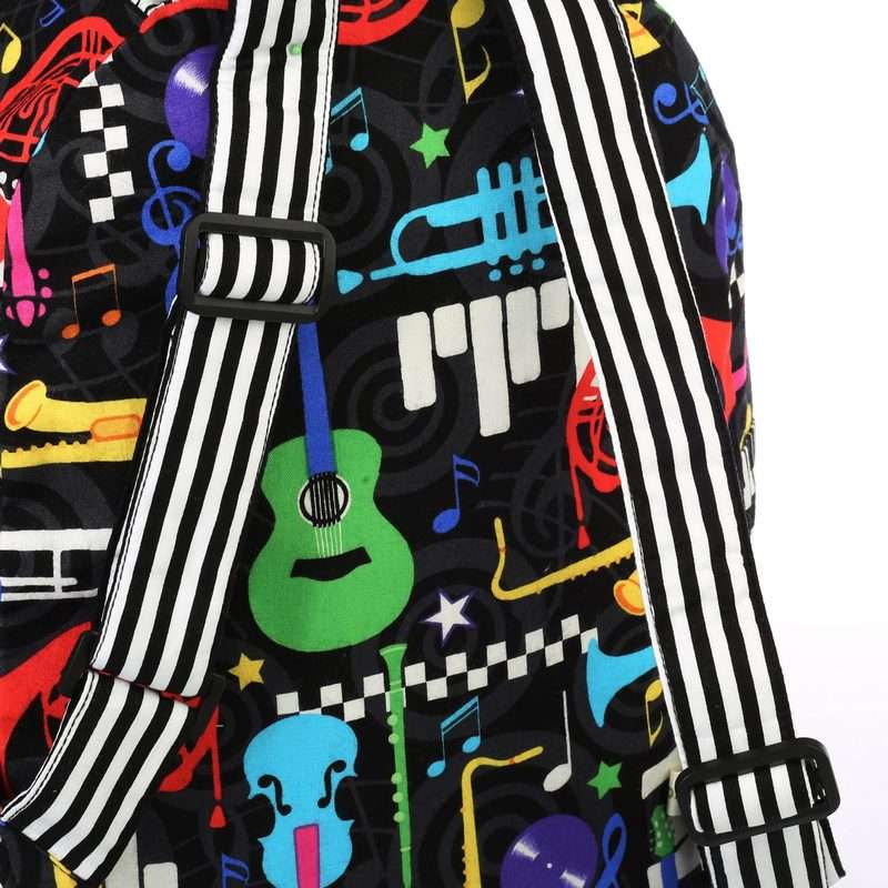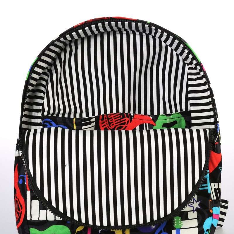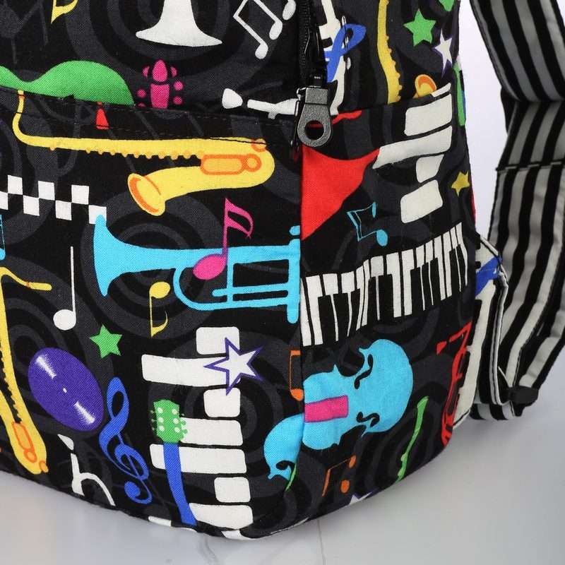 Παιδικό χειροποίητο υφασμάτινο σακίδιο πλάτης με φερμουάρ και μοτίβο μουσικά όργανα. Εσωτερικά είναι επενδεδυμένο με ριγέ ασπρόμαυρο βαμβακερό ύφασμα. Το πάνω μέρος κλείνει με φερμουάρ και εσωτερικά υπάρχουν δύο τσέπες για εύκολη τακτοποίηση. Οι τιράντες αυξομειώνονται για καλύτερη εφαρμογή.