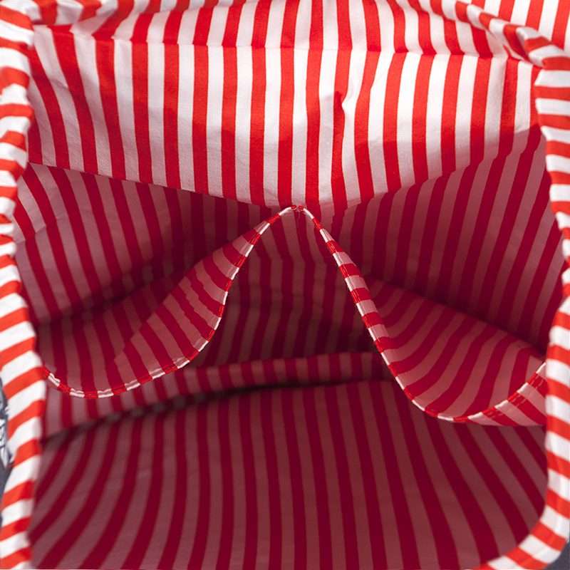 είναι επενδεδυμένο με πορτοκαλί ριγέ ύφασμα. Το πάνω μέρος μαζεύει με