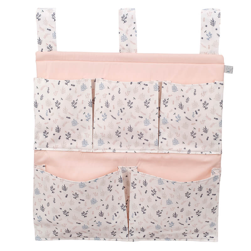 Κρεμαστή βαμβακερή θήκη οργάνωσης κούνιας. Διαθέτει δύο μεγάλες και τρεις μικρότερες θήκες για να αποθηκεύετε μέσα τα αγαπημενα αντικειμενα ύπνου του μικρού σας, όπως τα πιτζαμάκια, τις πιπίλες και το αγαπημένου του κουκλάκι.
