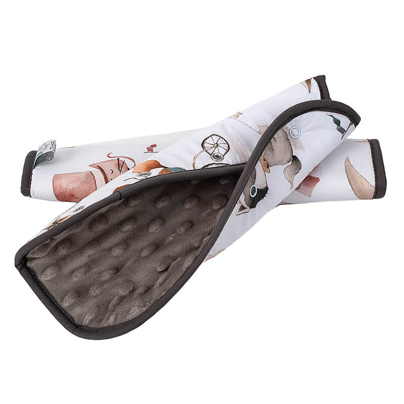 Είναι χειροποίητα και ραμμένα με δύο διαφορετικά υφάσματα στις πλευρές του. Από τη μία τους πλευρά, έχουν βαμβακερό ύφασμα με πιστοποίηση Oeko-Tex 100 και από την άλλη, απαλό βελουτέ minky με ανάγλυφο σχέδιο. Το μήκος τους είναι 28cm, ιδανικό ώστε να καταλαμβάνουν περισσότερη επιφάνεια από τις ζώνες ασφαλείας.