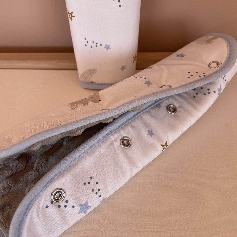 Είναι χειροποίητα και ραμμένα με δύο διαφορετικά υφάσματα στις πλευρές του. Από τη μία τους πλευρά, έχουν βαμβακερό ύφασμα με πιστοποίηση Oeko-Tex 100 και από την άλλη, απαλό βελουτέ minky με ανάγλυφο σχέδιο. Το μήκος τους είναι 28cm, ιδανικό ώστε να καταλαμβάνουν περισσότερη επιφάνεια από τις ζώνες ασφαλείας.