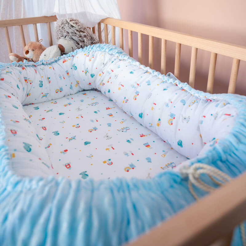 Βαμβακερή φωλίτσα με ρομαντικό print από ζώα του δάσους, για βρέφη. Διαθέτει μαλακά πλαϊνά και αφρώδες στρωματάκι και διατίθεται σε διαφορετικά χρώματα της εσωτερικής βελουτέ πλευράς.