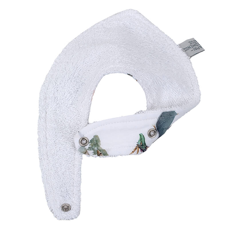 Χειροποίητη, βαμβακερή σαλιάρα-μπαντάνα διπλής όψης, για βρέφη. Η σαλιάρα προσαρμόζεται στο κατάλληλο ύψος, χάρη στα τρουκς δύο θέσεων στο πίσω μέρος της.