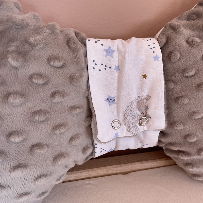Είναι χειροποίητο και ραμμένο με δύο διαφορετικά υφάσματα στις πλευρές του. Από τη μία του πλευρά, έχει βαμβακερό ύφασμα με πιστοποίηση Oeko-Tex 100 και από την άλλη, απαλό βελουτέ minky με ανάγλυφο σχέδιο. Η διπλή του όψη, σας επιτρέπει να επιλέγετε την κατάλληλη πλευρά ανάλογα με την εποχή και τη θερμοκρασία του χώρου. Διατίθεται σε διαφορετικά χρώματα εσωτερικής πλευράς, για να επιλέξετε εκείνη που ταιριάζει καλύτερα με τα αξεσουάρ/προστατευτικά καλύμματα του καροτσιού σας.