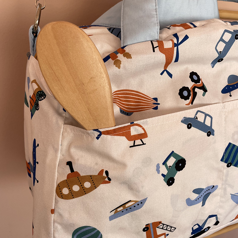Είναι χειροποίητο και ραμμένο με δύο διαφορετικά υφάσματα. Στην εξωτερική του πλευρά, πρωταγωνιστεί το μοτίβο Vehicles ενώ η εσωτερική πλευρά είναι επενδυμένη με βαμβακερό, λευκό καπιτονέ ύφασμα. Διαθέτει 4 εσωτερικές θήκες για καλύτερη οργάνωση και κλείνει με λευκό φερμουάρ. Μπορεί να κρατηθεί στο χέρι από τα 2 του χερούλια, καθώς και στον ώμο, χάρη στον αυξομειούμενο και αποσπώμενο ιμάντα.